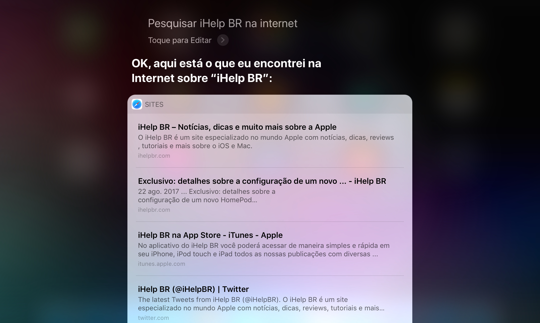 Agora, ao perguntar algo para a Siri, se ela não souber a resposta vai pesquisar no Google ao invés do Bing. O usuário, é claro, também pode pedir diretamente para que a assistente faça uma busca na internet. A busca por imagens continua sendo feita pelo serviço Bing, enquanto os vídeos exibidos nos resultados são do YouTube.
