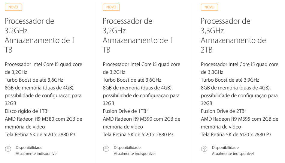 A Apple removeu o iMac de 27 polegadas tradicional e atualizou todos os modelos com tela Retina 5K, começando pelo modelo com Intel Core i5 de quatro núcleos e 3.2GHz (com Turbo Boost de 3.6GHz), 8GB de memória RAM, placa de vídeo AMD Radeon R9 M380 com 2GB de memória e armazenamento em HDD de 1TB. Os outros modelos contam com armazenamento em Fusion Drive de 1TB e 2TB, além de melhores placas de vídeo da AMD Radeon R9.