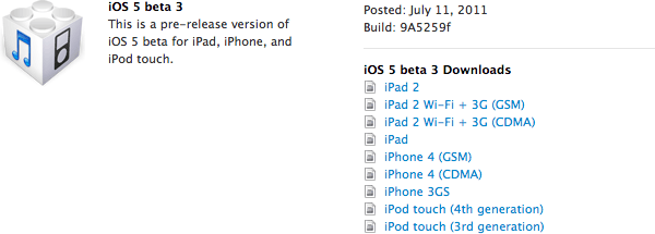 A Apple liberou há pouco tempo o beta 3 do iOS 5 para iPads, iPhones e iPods Touch, disponíveis para download apenas para download no iOS Dev Center, na build 9A5259f.