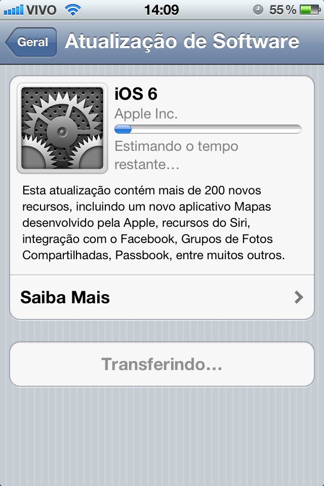Você também pode atualizar o iOS pelo computador utilizando o iTunes, basta conectar o iGadget ao PC e transferir a atualização. Como o iOS 6 foi liberado hoje, muitas pessoas estão tentando atualizar o sistema ao mesmo tempo, o que causa uma certa lentidão nos servidores da Apple, por isso se você não conseguir atualizar agora ou a transferência estiver muito lenta, tenha calma.