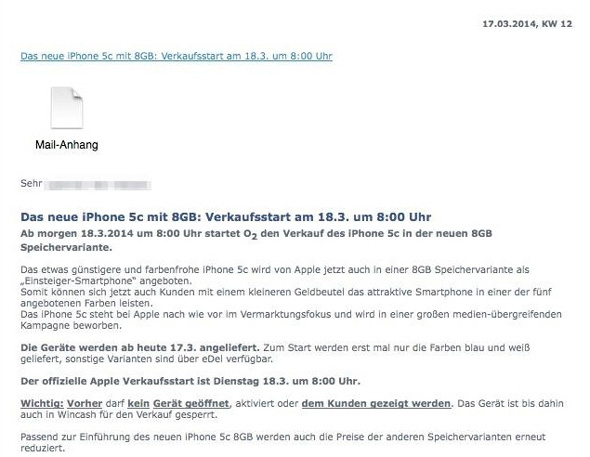 Segundo um rumor divulgado pelo site americano Engadget, a Apple pode lançar em breve uma versão mais barata do iPhone 5c, contando com apenas 8GB de memória interna. Um documento interno da operadora alemã O2 chega inclusive a mencionar que o lançamento da nova versão será feito já amanhã, dia 18 de março.
