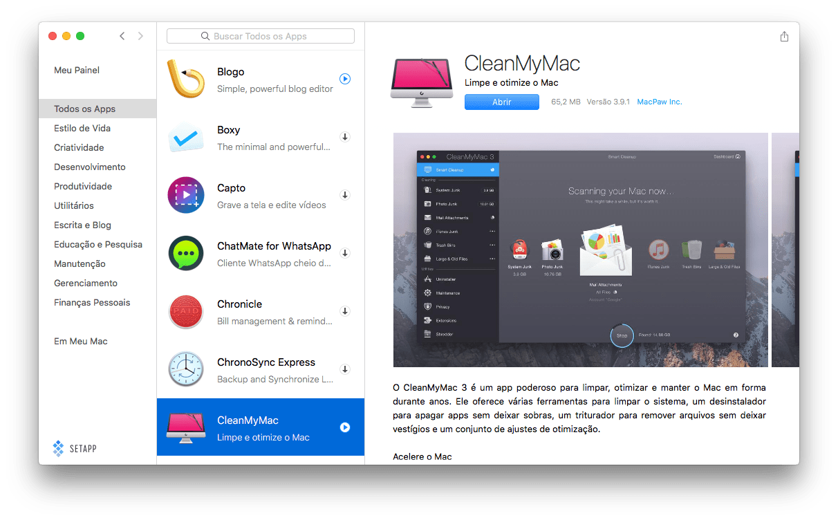 O catálogo oferece várias opções, incluindo os próprios aplicativos da MacPaw. Tudo é separado por categorias, para facilitar na hora de encontrar um novo aplicativo. Assim como na Mac App Store, o Setapp mostra a descrição e imagens de cada um dos aplicativos disponíveis.
