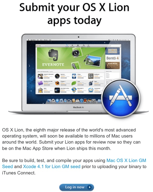 OS X Lion, o oitavo grande lançamento do sistema operacional mais avançado do mundo, estará em breve disponível para milhões de usuários de Macs ao redor do mundo. Envie os seus apps do Lion para aprovação agora, para que eles estejam na Mac App Store quando o Lion for liberado neste mês.