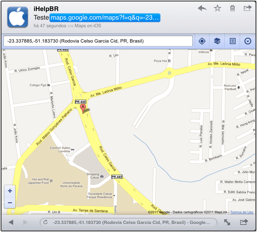 Você também pode compartilhar um local marcado no Mapa, basta ir nas informações de um “Alfinete” > “Compartilhar Mapa” > “Tuitar”.