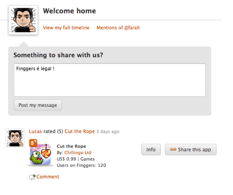 Apresento a vocês o Finggers, um site onde você  compatilha, dá uma nota e comenta seus apps. Seguindo seus amigos, você fica sabendo quando eles adicionam, comentam ou qualificam algum app.