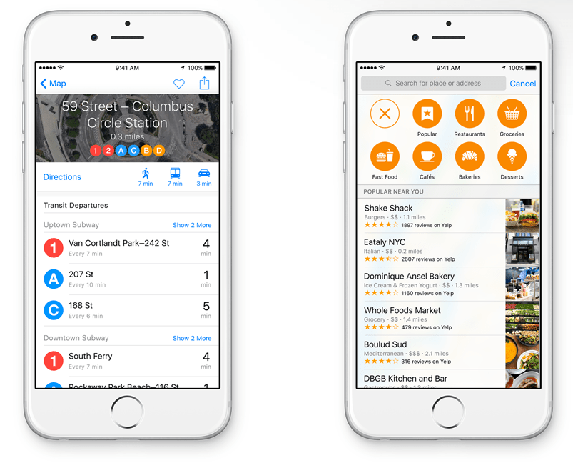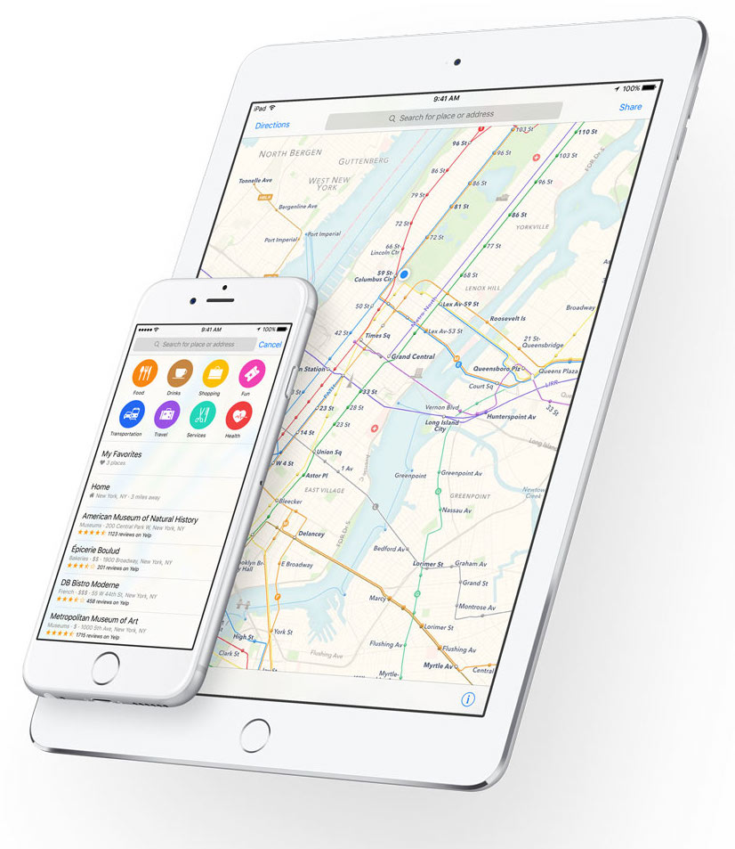 O aplicativo Mapas do iOS 9 também foi aprimorado, agora com informações de transporte público e sugestões de locais para visitar com base nas informações do usuário. O sistema agora deve sugerir, por exemplo, locais para você tomar café da manhã em certo horário, ou restaurantes para jantar durante a noite. As novidades para o Mapas, porém, inicialmente só estarão disponíveis em algumas cidades dos Estados Unidos e China.