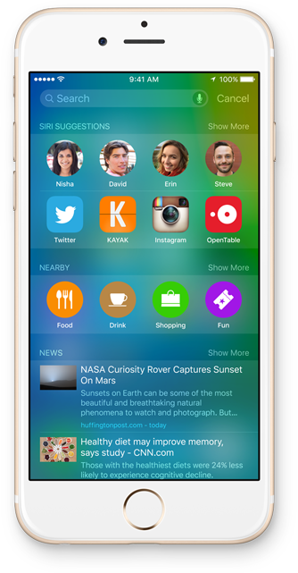 A inteligência do recurso, porém, se extende para todo o sistema. O iOS 9 reconhecerá os hábitos do usuário para recomendar certas coisas, como por exemplo um aplicativo que você costuma usar todos os dias naquele mesmo horário, ou uma pessoa para a qual você costuma ligar sempre. Atalhos também serão exibidos na tela de bloqueio do sistema.