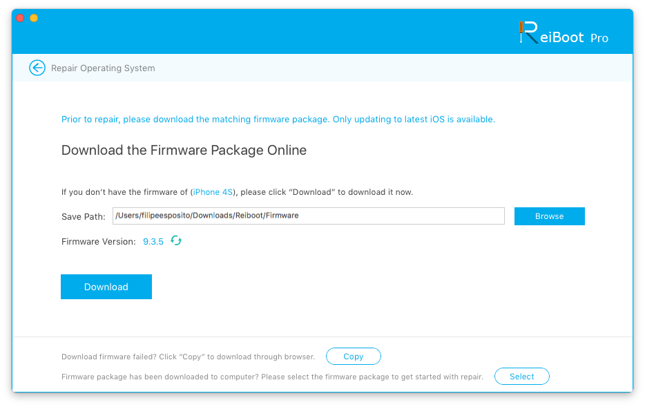 Ao escolher a opção, o ReiBoot pede que você selecione o firmware (arquivo IPSW) de instalação do iOS correspondente ao seu aparelho. Se você não entende nada disso, também não tem problema: o próprio aplicativo disponibiliza uma opção que baixa o firmware correto e mais recente ali mesmo. Basta clicar em “Download” e aguardar até a conclusão da transferência.