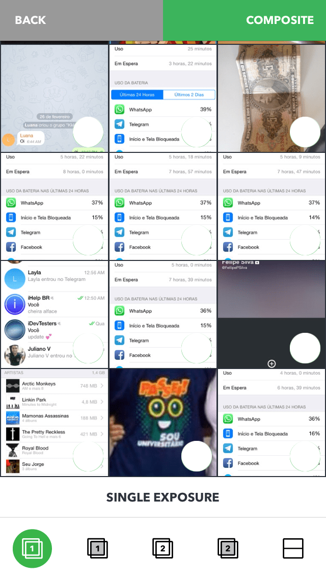 Logo ao abrir o aplicativo, ele mostra as três sessões básicas em que suas funções foram divididas: Camera, Photo e Composite. Sem mais opções ou distrações na tela, o desenho leve dos ícones combina perfeitamente com o plano de fundo, dando uma sensação de algo mais rústico, porém sofisticado.