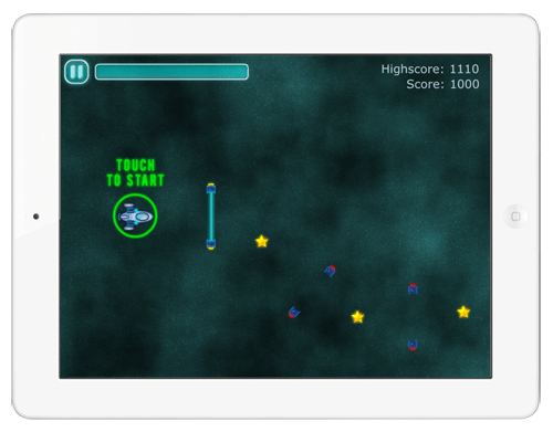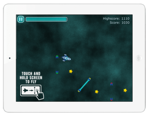 Para movimentar a nave você deve tocar nela e ainda com o dedo sobre ela, arrastar para o lugar em que desejar: