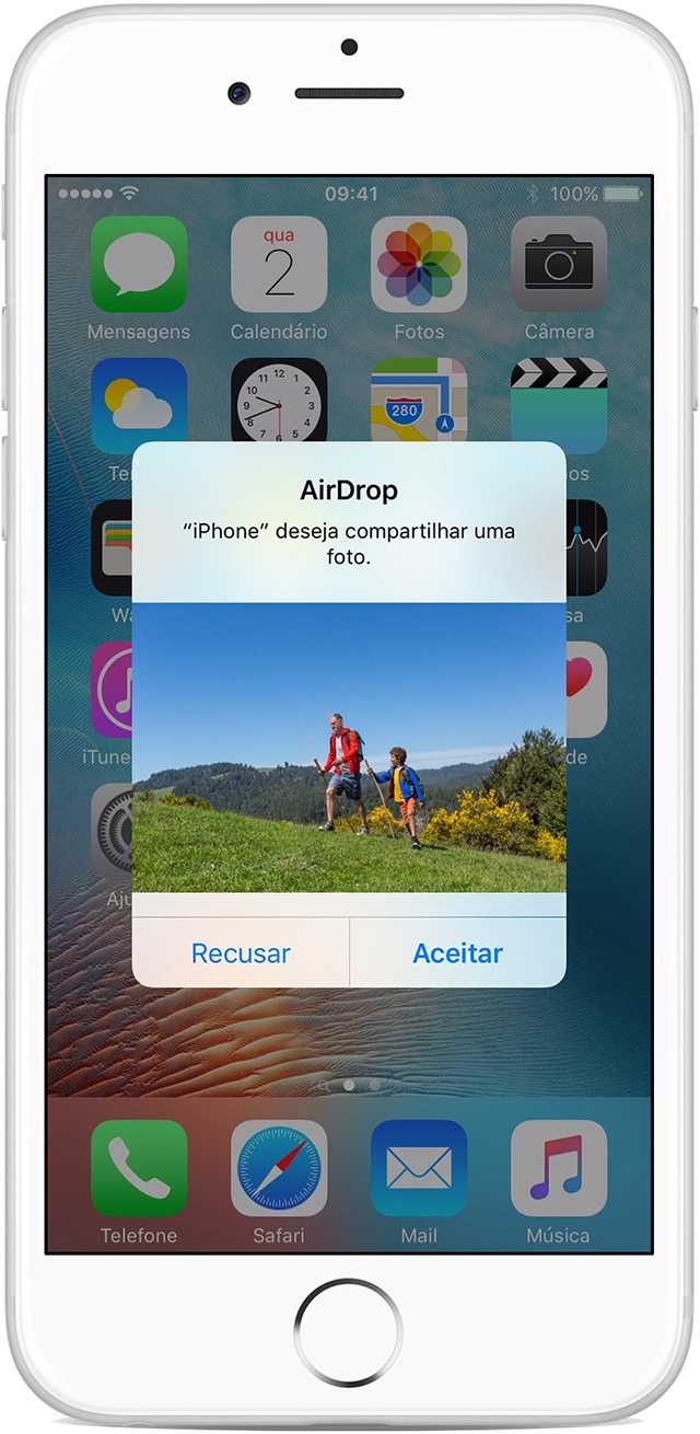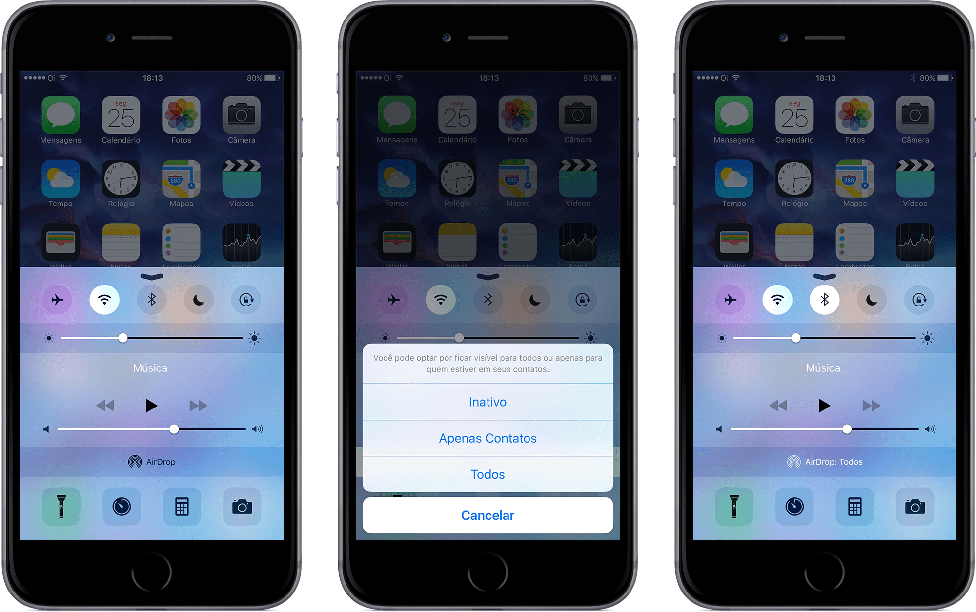 Ative o AirDrop no iPhone, iPod touch ou iPad abrindo a Central de Controles, deslizando o dedo da parte inferior da tela para cima. Toque em AirDrop para exibir e selecionar uma das opções. Vale lembrar que é necessário que os dois dispositivos estejam com o AirDrop ativado.