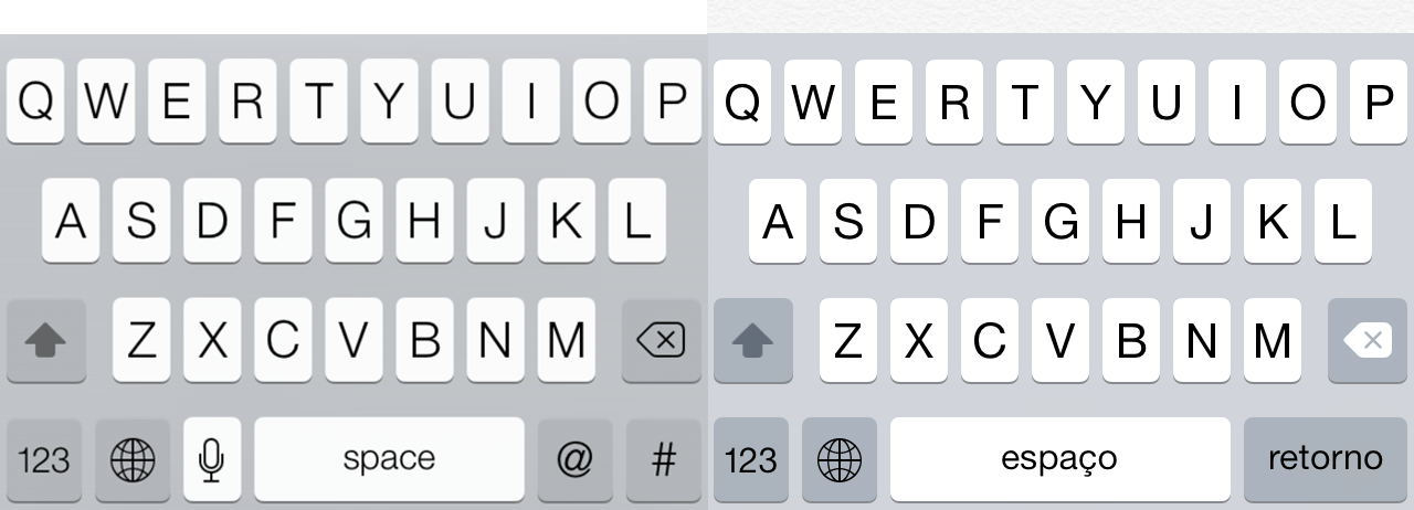 O teclado foi levemente alterado (iOS 7 à esquerda, 7.1 beta 3 à direita):