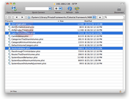 Pegue os arquivos “AVCapture.plist, CameraRollValidator.plist e MediaValidator.plist” que foram descompactados no passo anterior, e cole na pasta “/System/Library/PrivateFrameworks/Celestial.framework/N88/”
