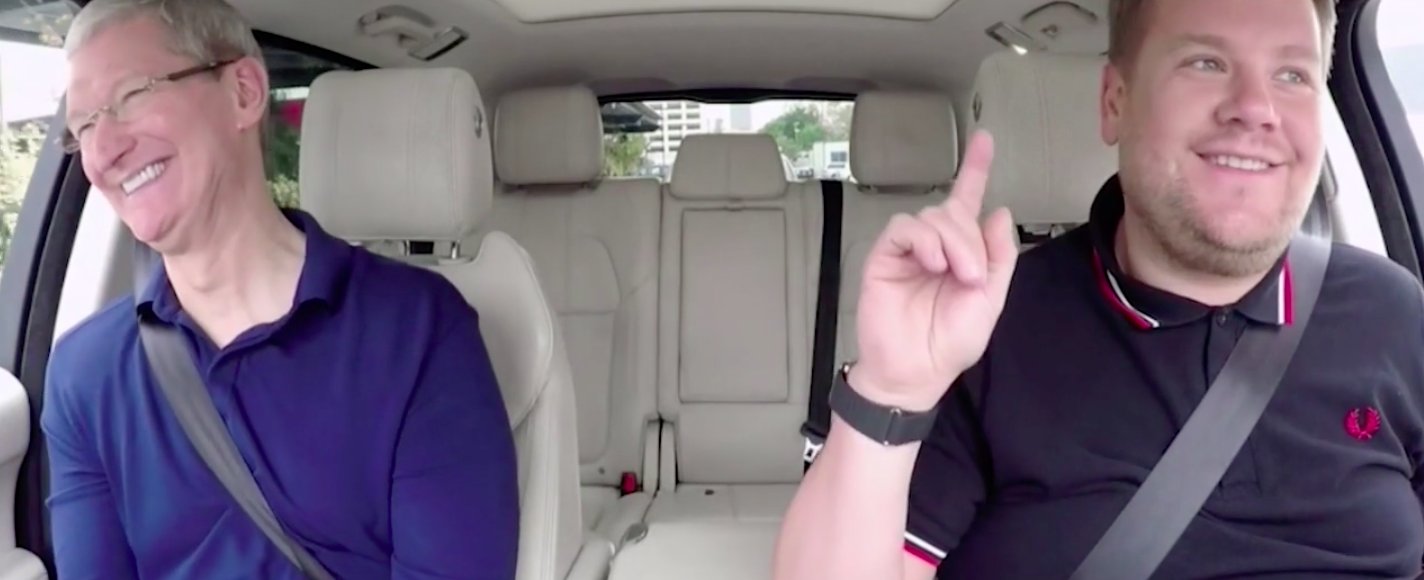 Tim Cook e James Corden no Carpool Karaoke. Imagem: Apple